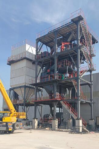 原料經(jīng)過電子秤進入到皮帶輸送機中,由全封閉的提升機將物料入到五孔碾磨制砂機內(nèi)進行破碎處理,再由空氣篩對破碎后的物料進行篩分、選粉處理,篩分后的較大物料會返回五孔碾磨制砂機中進行二次破碎,符合要求的砂子則經(jīng)過加濕拌合機由傳送帶輸送至成品倉中;篩分過程中的粉塵會經(jīng)粗細粉分離機進入到布袋收塵器內(nèi),而其中較大的粗顆粒會在粗細粉分離機的作用下,按需求在成品砂中進行回摻,細粉塵將通過風(fēng)力進入到布袋收塵器,作為副產(chǎn)品進行使用。